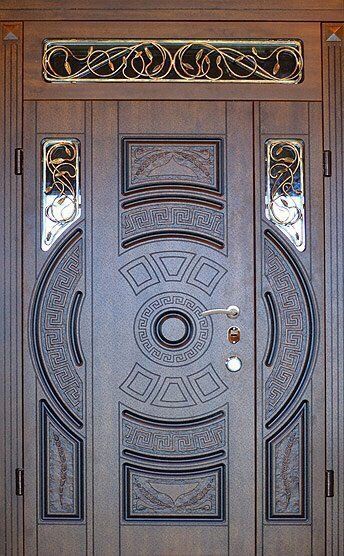 Парадные двери относятся к изделиям премиум-класса. Изготавливаются такие модели из металла толщиной не менее 2,0 мм, конструкция усиливается ребрами жесткости. Основной фактор, делающий парадные двери таковыми – их внешняя отделка. Для декора этих дверей, как правило, используют массив дуба, ясеня или сосны, натуральный шпон, корабельную фанеру, МДФ-панель, покрытую атмосфероустойчивой пленкой Винорит (VINORIT). Декоративные вставки из антивандального стекла, с применением элементов ковки, рисунок, который будет сочетаться с рисунком решеток на окнах, придаст коттеджу неповторимый внешний вид. Можно декорировать дверь витражным узором – и ваш дом заиграет яркими красками. По конструкции парадные двери могут быть как одностворчатыми, так и двустворчатым. При достаточной высоте проема, можно изготовить входную группу с декоративной вставкой сверху – прямоугольную или в виде арки. Терморазрыв в конструкции парадной двери сохранит тепло в доме, и предотвратит промерзание и кондедсирование двери в холодное время года, при этом не требуется обустройство в доме холодного тамбура.