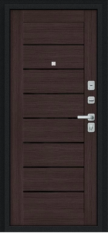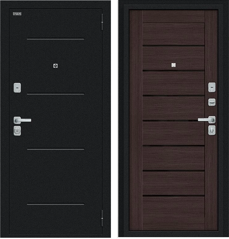 Надежная входная Дверь Браво Техно/BChrome Букле черное/Wenge Melinga премиум класса по цене 35 815 руб. Большая толщина стали защитит от проникновения в ваш дом, квартиру или коттедж. Используется очень качественная фурнитура: замки, цилиндры, ручки, защелки. Покрытие и отделка двери изготовлено под внимательным контролем производителя. Дверь имеет долгий срок службы и гарантию.